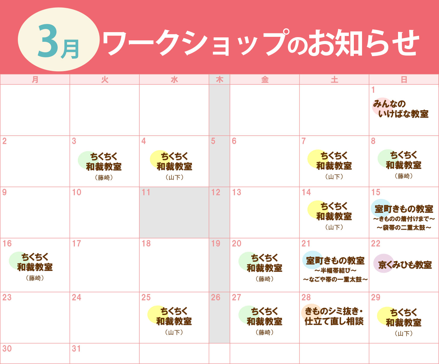 NEWS more 2026.02.04 2月13日からは『2月23日はふろしきの日&3分で着れるかんたん着物YOUR』 2026.02.03 2月11日(水・祝)臨時休業いたします。『吉祥の刻 ~一生に一度の特別な瞬間を演出する~』は2月10日(火)16:00まで。 2026.02.01 3月の着付室貸出の受付開始しました 2026.01.24 3月のワークショップは1月31日(土)から受付開始いたします 2026.01.23 ワークショップ参加料改定のお知らせ▶2026年4月より WORK SHOP その他 3月のワークショップ申込みについて PAGE TOP