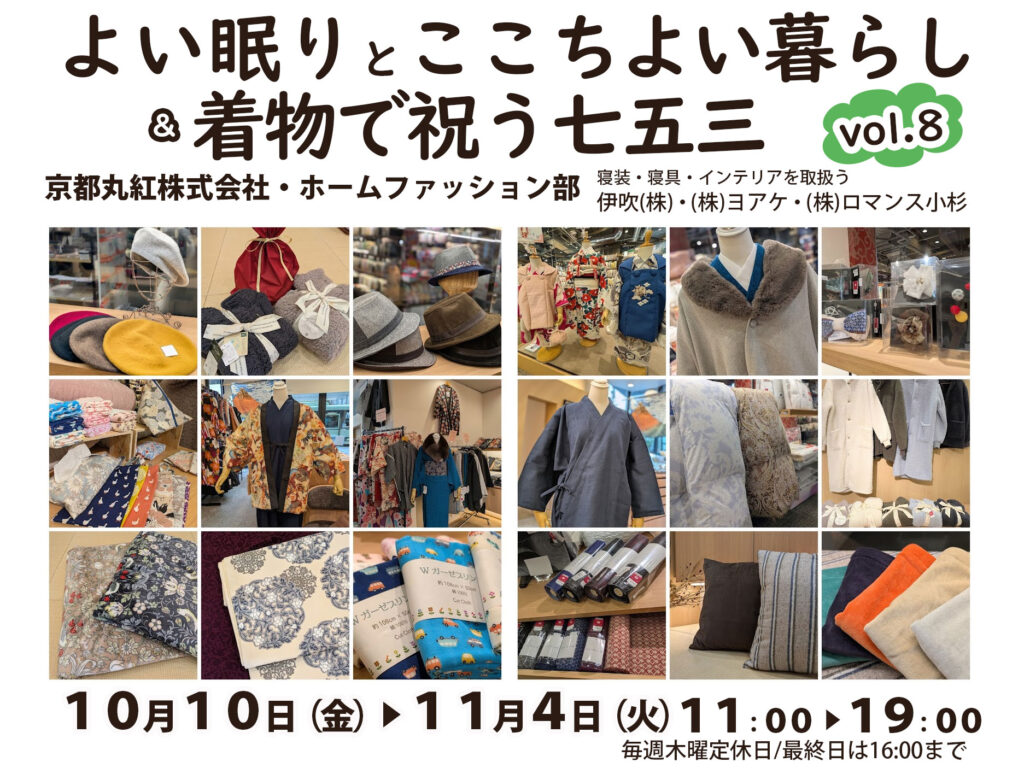 京都丸紅株式会社・ホームファッション部(伊吹(株)・(株)ヨアケ・(株)ロマンス小杉)による『よい眠りとここちよい暮らしvol.8&着物で祝う七五三』は、11月4日(火)が最終日となります。