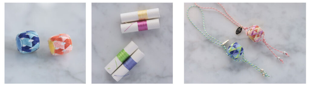 春色のカラフルなゆびぬきを作り、ストラップや根付けに仕立てましょう。
