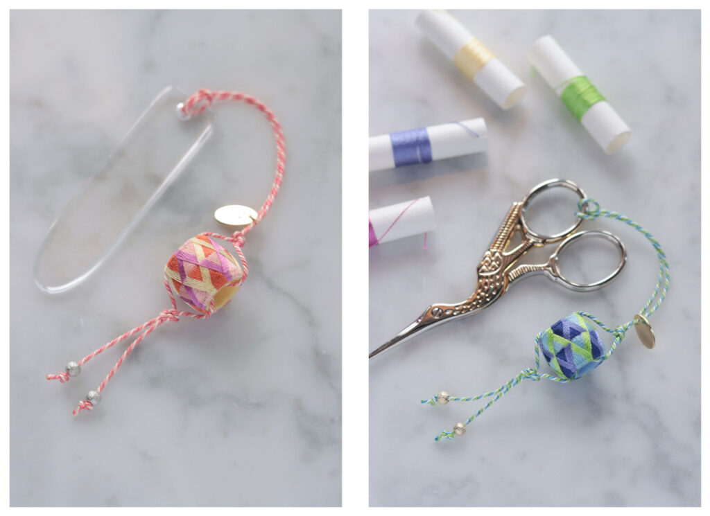 そのまま刺繍はさみやカバンの持ち手などに通して、華やかなシザーキーパーやバッグチャームとしても。